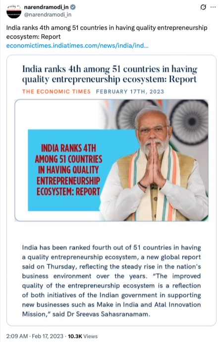 This role culminated in the G20 Startup20 policy paper on sustainability, which notably cited the GEM Global Report 2022/23, underscoring the direct influence of GEM data and its dissemination on international policy discourse. Adding to the impact that year, it was a pleasant surprise to see the Prime Minister of India, Shri Narendra Modi, tweet about insights from GEM research (see image to the right).